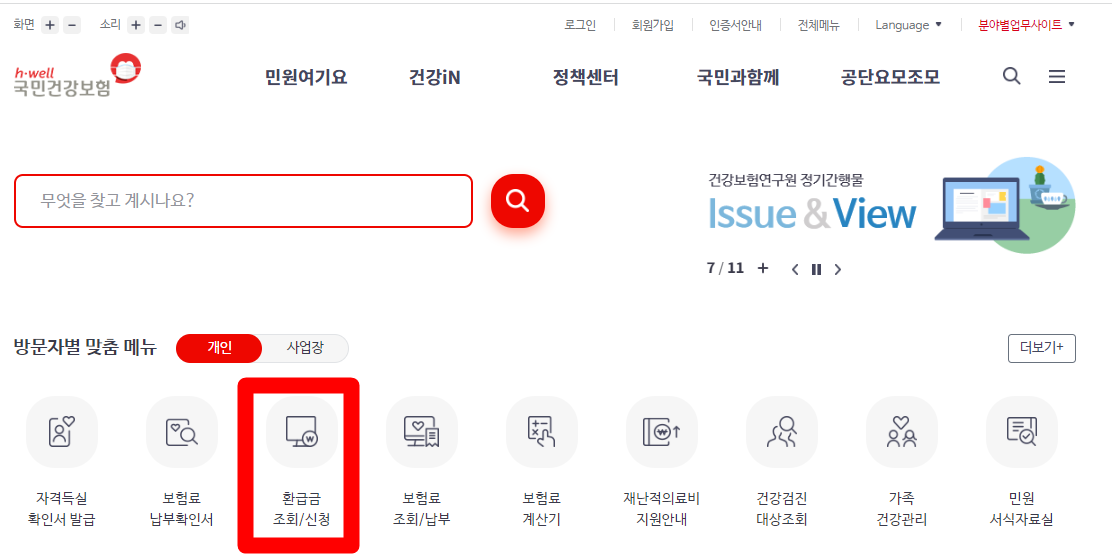 -로그인을 하시고 홈페이지 화면 ▶ 방문자별 맞춤 메뉴 ▶ 환급금 조회 & 신청 메뉴를 클릭하여 접속 하셔야 합니다.